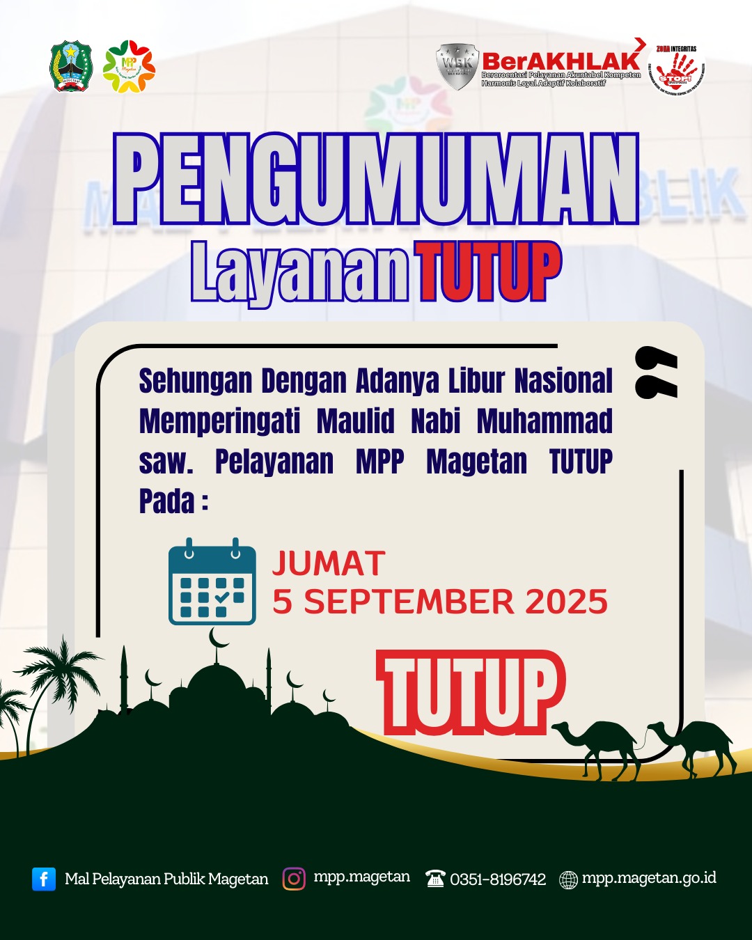 Dalam rangka memperingati Maulid Nabi Muhammad SAW 1447 H, pelayanan di Mal Pelayanan Publik (MPP) Magetan akan TUTUP pada: