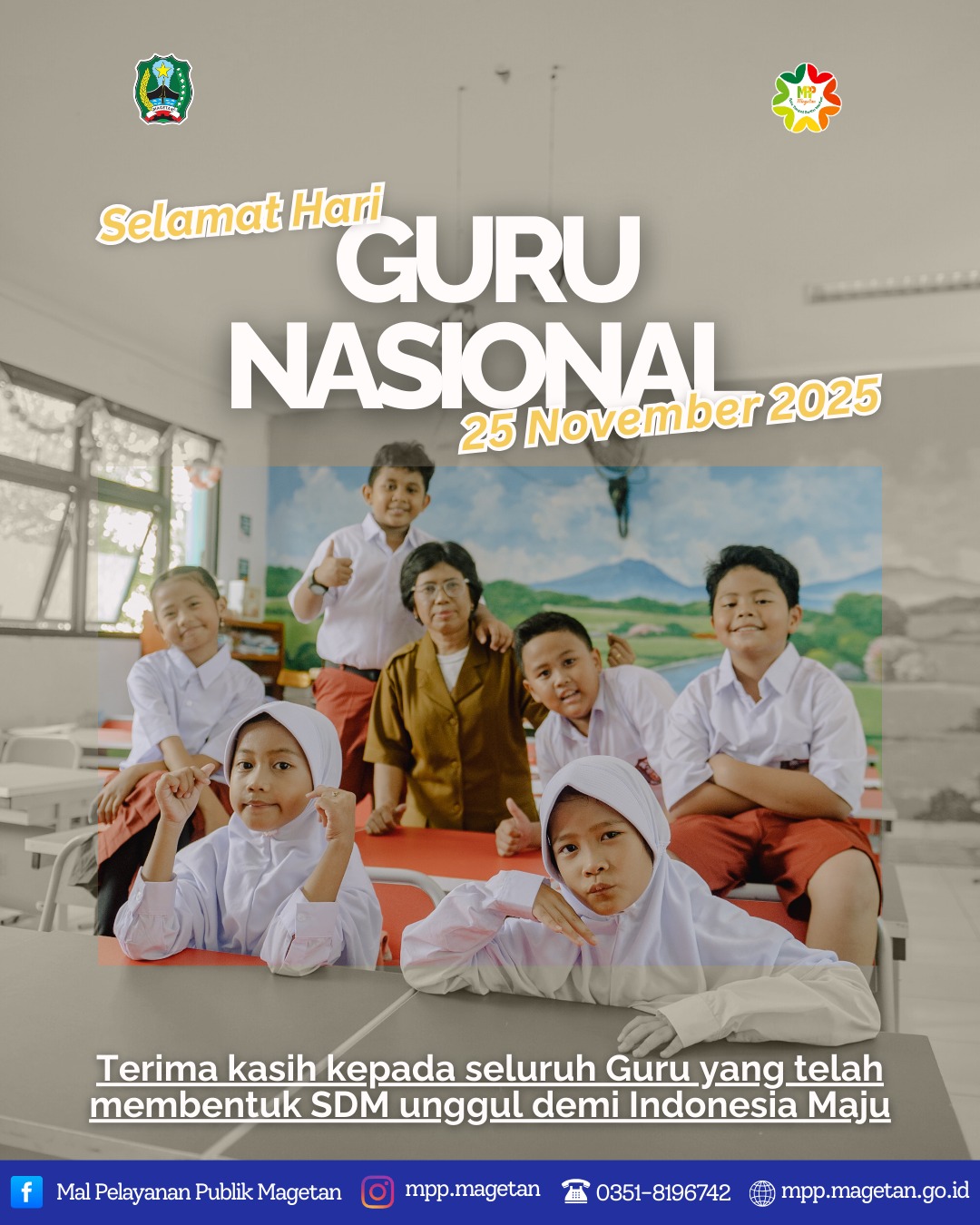Tema yang diangkat dalam peringatan Hari Guru Nasional tahun 2025 ini sejalan dengan semangat untuk mewujudkan SDM unggul demi Indonesia Maju. MPP Kabupaten Magetan mendukung penuh upaya peningkatan kualitas pendidikan melalui layanan publik yang profesional, cepat, dan mudah diakses demi menunjang kemajuan daerah dan negara.